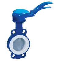 Przepustnica bezkołnierzowa LYCENE z napędem ręcznym dźwigniowym, dysk: powlekany PFA, wykładzina: PTFE, korpus: GGG40 epoksyd., Pnom 1,0 MPa, tmax=200 st.C DN 65