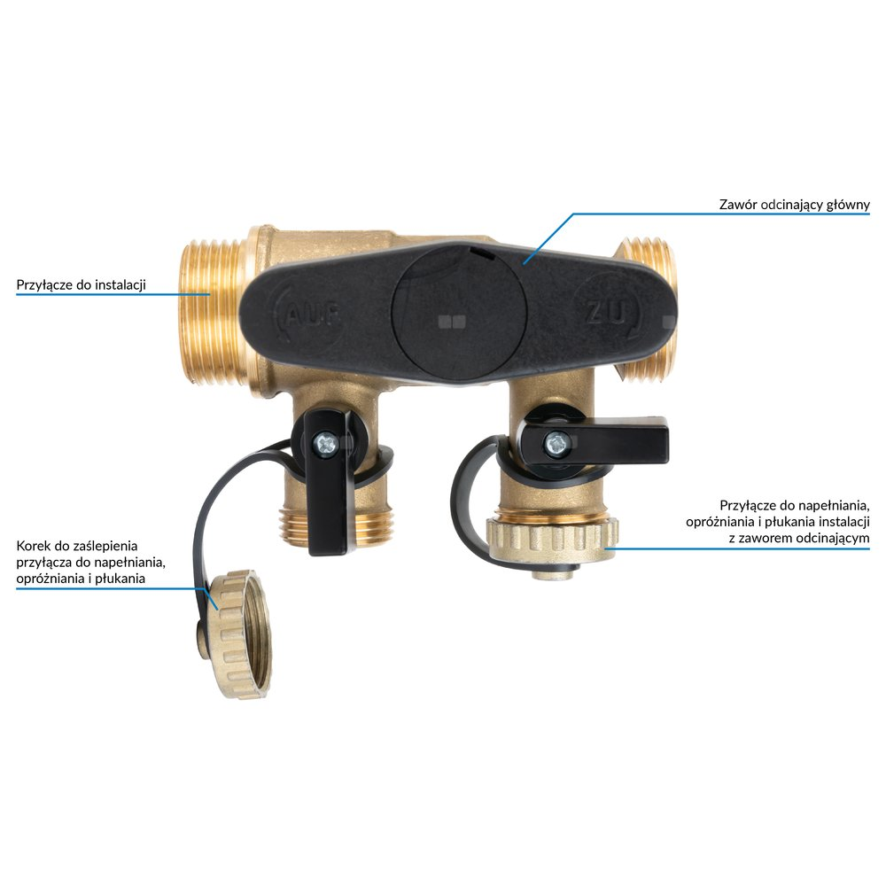 Umożliwia napełnienie, opróżnienie oraz wypłukanie/odpowietrzanie instalacji po podłączeniu do sieci wodociągowej lub stacji napełniającej.