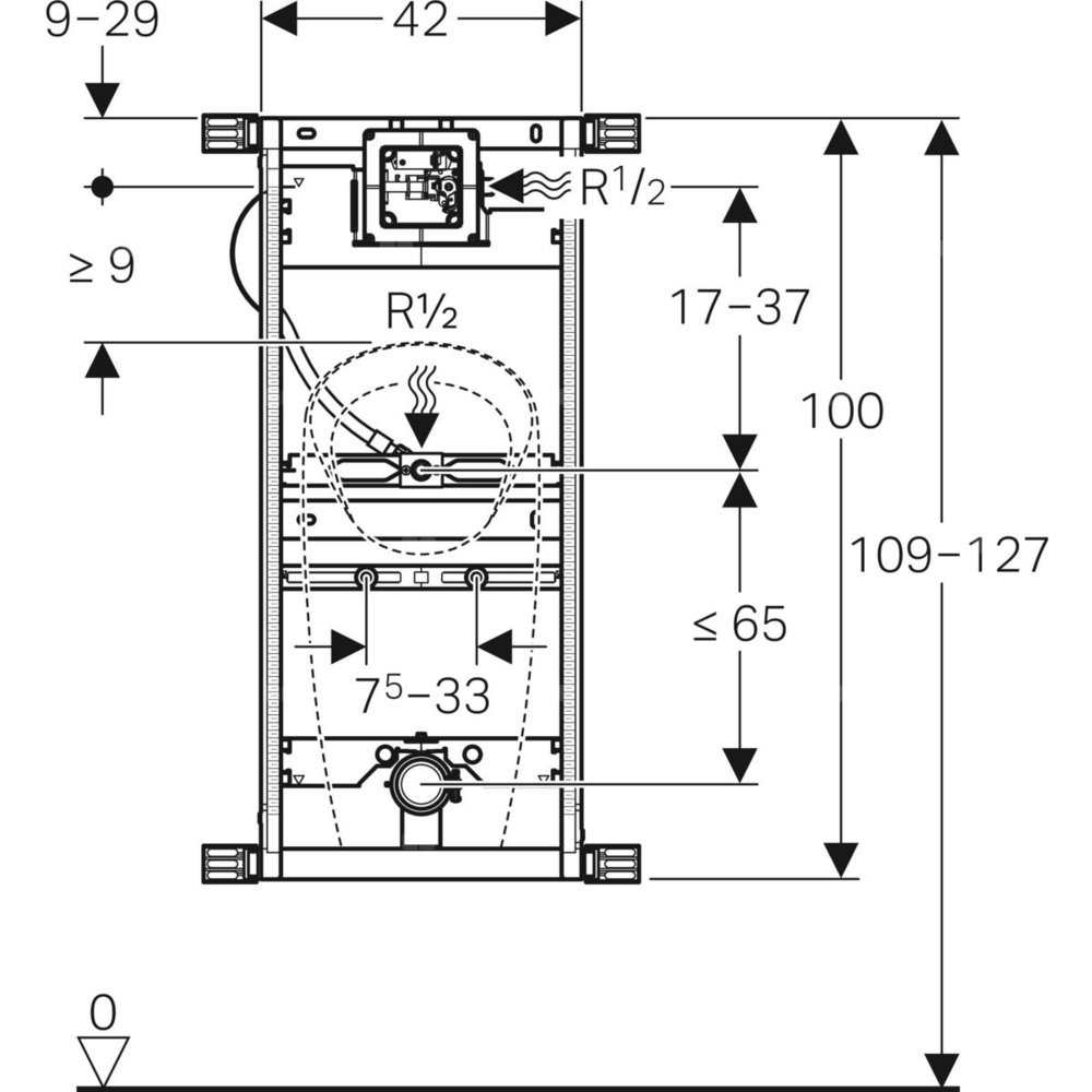 Zastosowanie: Do zabudowy ciężkiej Do montażu w ściankach instalacyjnych o częściowej wysokości lub wysokości pomieszczenia Do montażu pisuarów Do pisuarów Geberit Preda Do pisuarów Geberit Selva Do pisuarów Geberit Tamina Do montażu zaworów spłukujących Geberit do pisuaru (produkowanych od 2009 roku) Charakterystyka: Ocynkowana rama elementu montażowego Rama montażowa z czterema kątownikami montażowymi Możliwość regulacji głębokości zabudowy elementu montażowego w zakresie od 8–12,5 cm Głębokość zabudowy przy montażu bez kątowników 7,5 cm Obudowa ochronna otworu rewizyjnego chroni przed wilgocią i zabrudzeniami Możliwość dopasowania wysokości elementu do pisuaru, 109–127 cm Wstępne ustawienie do podłączenia pisuaru Geberit Preda Uniwersalna skrzynka montażowa do zaworów spłukujących Geberit do pisuaru Kostka zaciskowa do przyłącza elektrycznego umieszczona w uniwersalnej skrzynce montażowej Przyłącze wody z prawej strony na uniwersalnej skrzynce montażowej Przyłącze wody typu MasterFix i MeplaFix Kolanko przyłączeniowe montowane bez użycia narzędzi Zawór odcinający z dławikiem, wstępnie zamontowany Wstępnie zamontowana rura do przepłukania instalacji Obudowa ochronna otworu rewizyjnego 10,5 x 10,5 cm z możliwością skrócenia bez użycia narzędzi Elastyczny wężyk spłukujący Wężyk spłukujący umieszczony w prowadnicy zapobiegającej stagnacji wody Mocowanie wpustu Rp 1/2'' o regulowanej wysokości i szerokości Mocowanie kolana odpływowego o regulowanej wysokości i izolowane akustycznie Mocowania pisuarów M8, o regulowanej szerokości i wysokości Trawersy z oznaczonym środkiem, o regulowanym położeniu bez użycia narzędzi Znaczniki na trawersach ustawień do podłączenia pisuarów Geberit Preda i Selva Zakres dostawy: Przyłącze wody R 1/2" Obudowa ochronna otworu rewizyjnego Syfon pisuarowy ø 50 mm, z uszczelką do pisuaru Kolano przyłączeniowe z PE-HD, ø 50 / 63 mm Uszczelka ø 57 / 50 mm 2 zaślepki ochronne 2 pręty gwintowane M8 Elementy mocujące