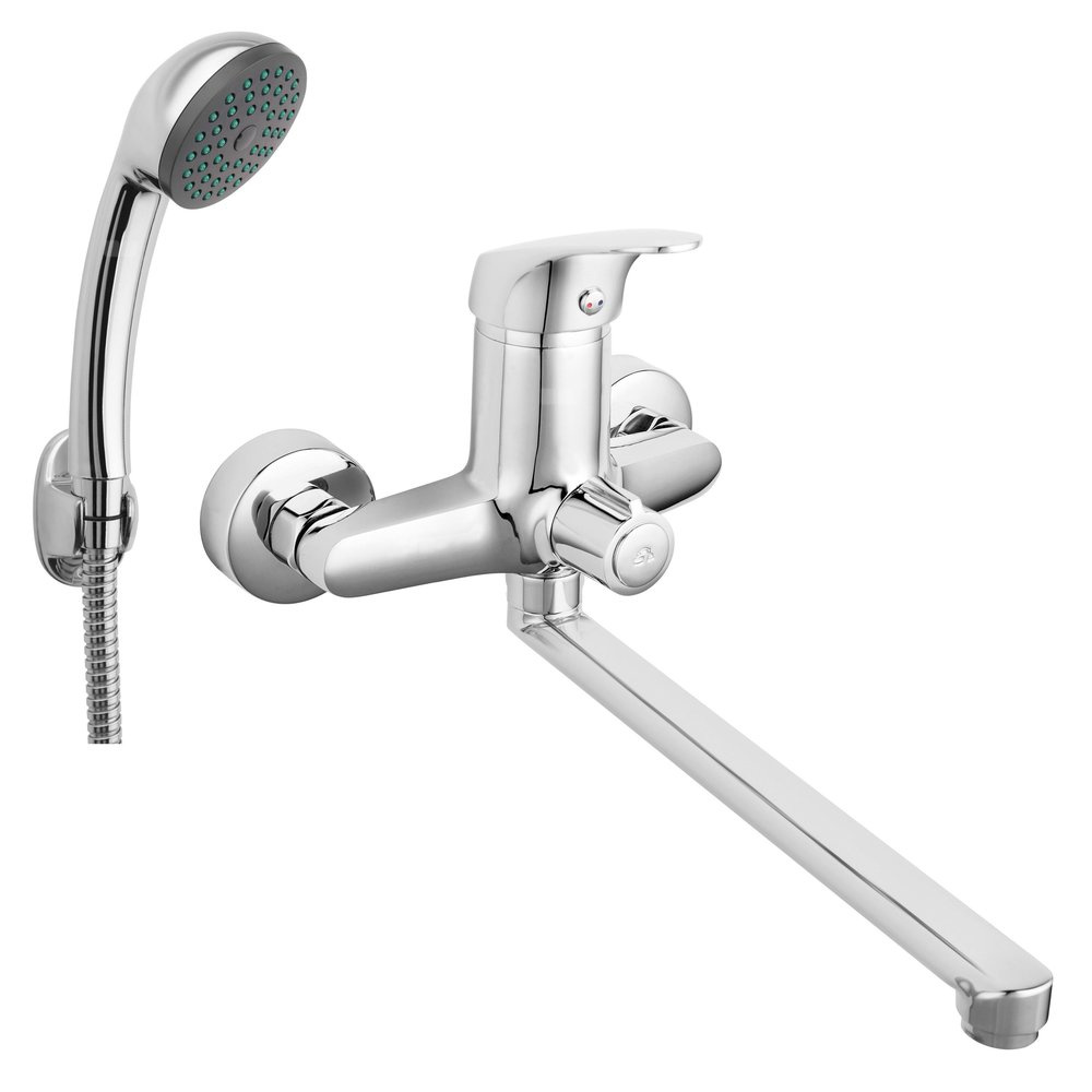 Bateria umywalkowo-wannowa z funkcjonalną, ruchomą wylewką, w zestawie z rączką natryskową z funkcją strumienia typu deszcz, uchwytem oraz wężem natryskowym. Ceramiczny, ergonomiczny przełącznik wylewka/natrysk zapewnia łatwość w obsłudze.