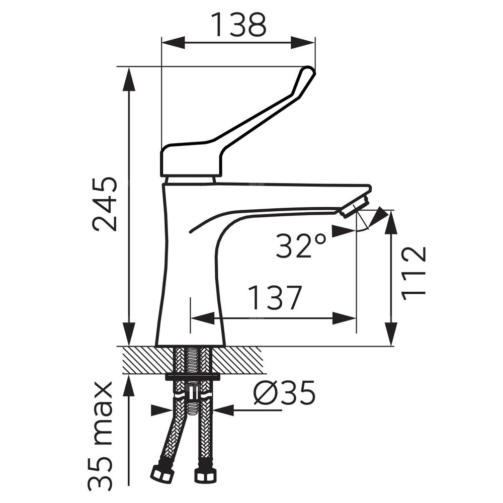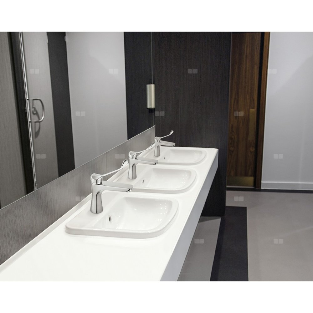 Bateria umywalkowa o delikatnym kształcie z prostokątnym uchwytem. Produkt posiada uchwyt medyczny z przedłużoną dźwignią, który ułatwia regulacje strumienia oraz temperatury wody.