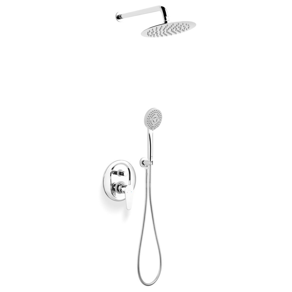 Kompletny podtynkowy zestaw natryskowy składający się z dwufunkcyjnej baterii w okrągłym stylu, wyposażonej w przełącznik z funkcją Anti-Stop. W zestawie znajdziemy także okrągłą deszczownicę w modnym designie typu slim z ramieniem prysznicowym, praktyczną rączkę natryskową z systemem łatwego usuwania kamienia Ferro Easy Clean, przyłącze kątowe z uchwytem i trwałym wężem prysznicowym w oplocie z metalu.
