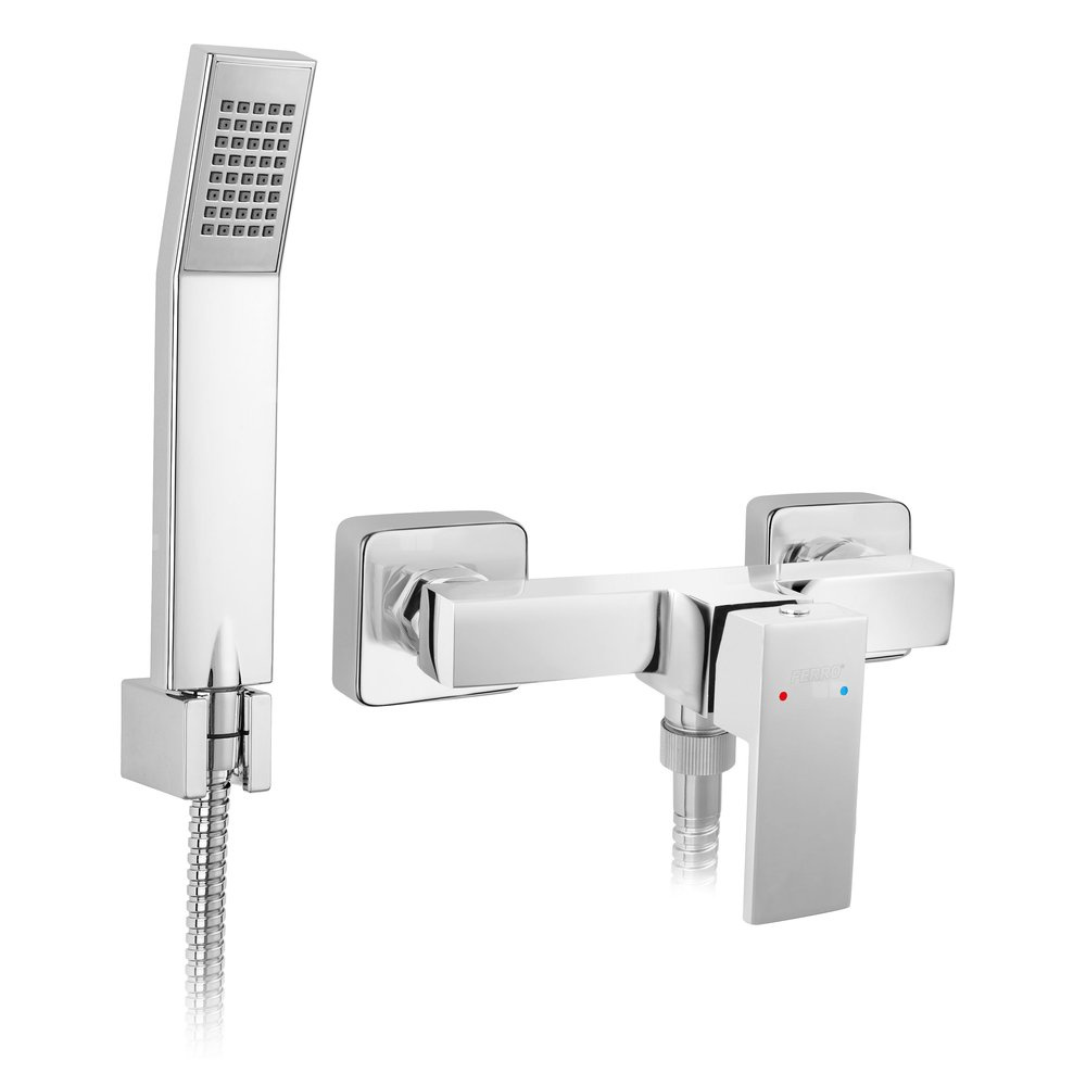 Charakterystyczna, kwadratowa bryła baterii sprawia, że jej dizajn doskonalone pasuje do nowoczesnego wnętrza. W komplecie znajdziemy prostokątną, modną 1-funkcyjną rączkę natryskową, trwały wąż prysznicowy w oplocie z metalu oraz uchwyt.