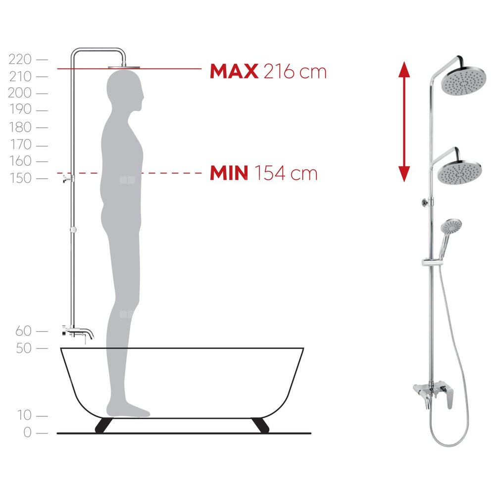 Zestaw natryskowy ALGEO to produkt, który łączy baterię wannową, kolumnę natryskową i natrysk przesuwny. To jedno urządzenie daje możliwość wyboru ulubionej formy kąpieli każdemu użytkownikowi domowej łazienki. Decydując się na zakup kolumny natryskowej z baterią wannową warto zwrócić uwagę na wysokość deszczowni. W przypadku zestawu natryskowego ALGEO dzięki możliwości płynnej regulacji wysokości zestawu (również po zamontowaniu) to maksymalnie aż 206 cm od dna wanny. Regulacja wysokości drążka pozwala