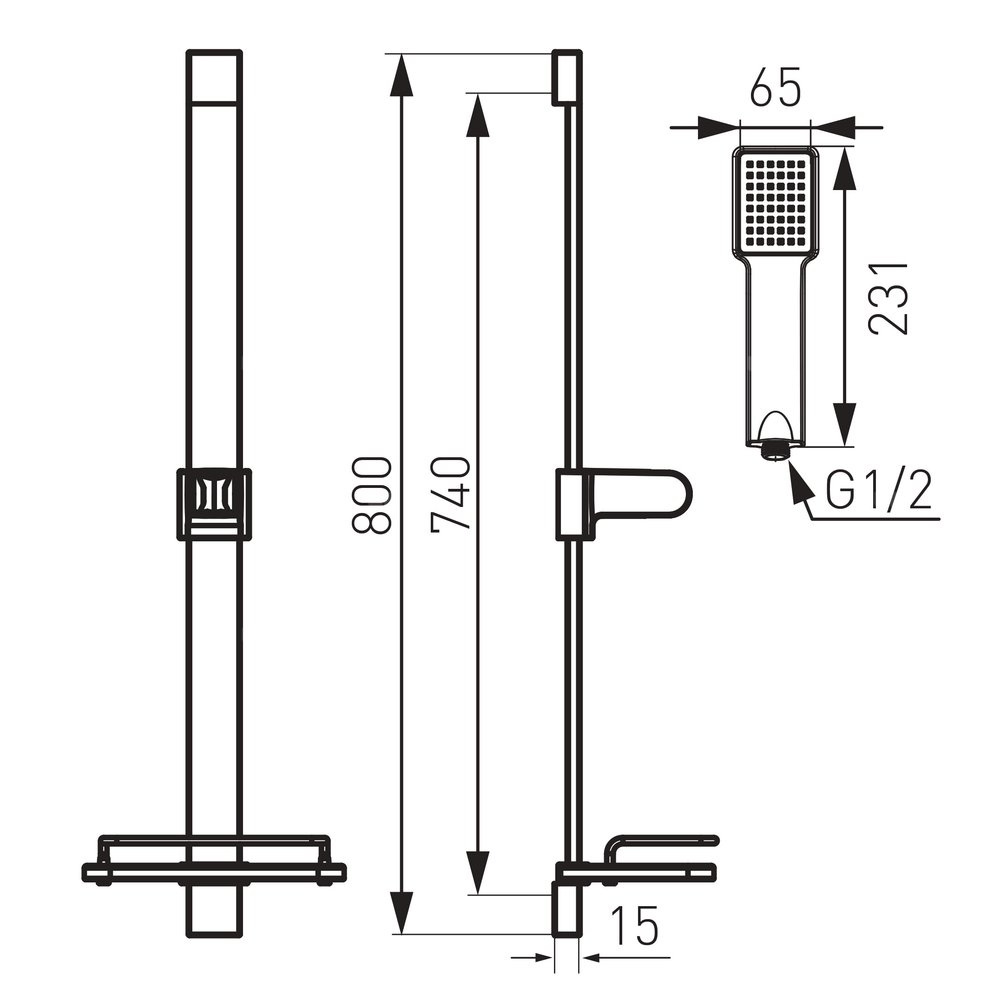 Zestaw składający się z kwadratowej, modnej rączki natryskowej z funkcją strumienia typu deszcz, dobranego stylistycznie drążka w prostokątnym kształcie oraz węża natryskowego. Dodatkowo w zestawie znajdziemy estetyczną półkę na kosmetyki. System Easy Clean ułatwi usuwanie osadu wapiennego z rączki natryskowej.