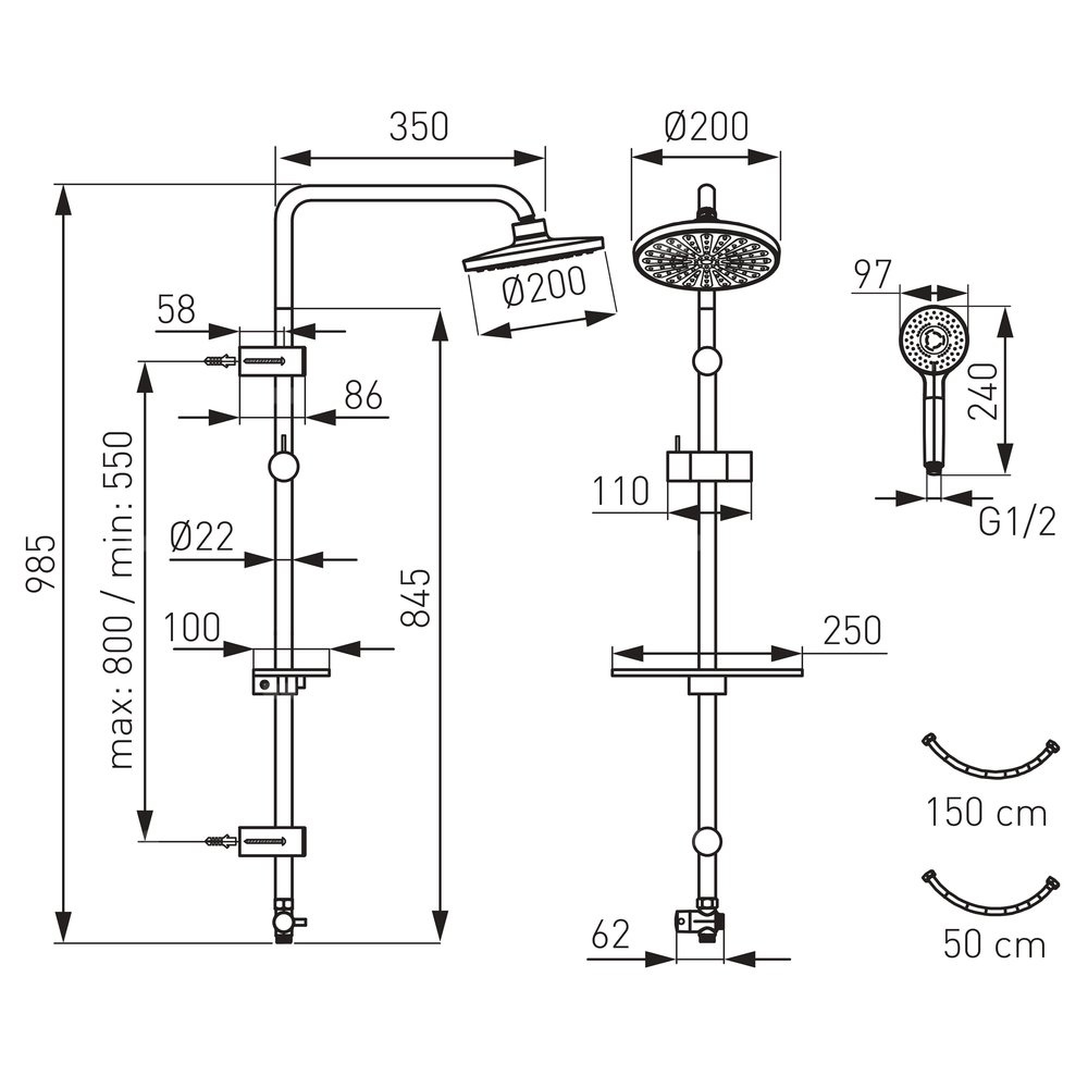 Zestaw natryskowy składający się z nowoczesnej, okrągłej deszczownicy 20 cm, 3-funkcyjnej rączki natryskowej z możliwością wyboru typu strumienia. System Easy Clean ułatwi usuwanie osadu wapiennego z rączki i deszczowni. W zestawie znajdziemy również praktyczną półkę na kosmetyki.