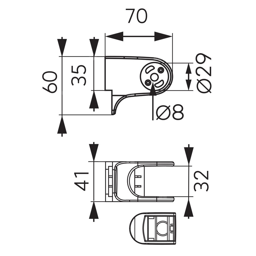 Uchwyt z regulacja kąta pochylenia rączki natryskowej. Możliwość zastosowania dowolnej rączki prysznicowej z wężem 1/2 " z nakrętką stożkową.