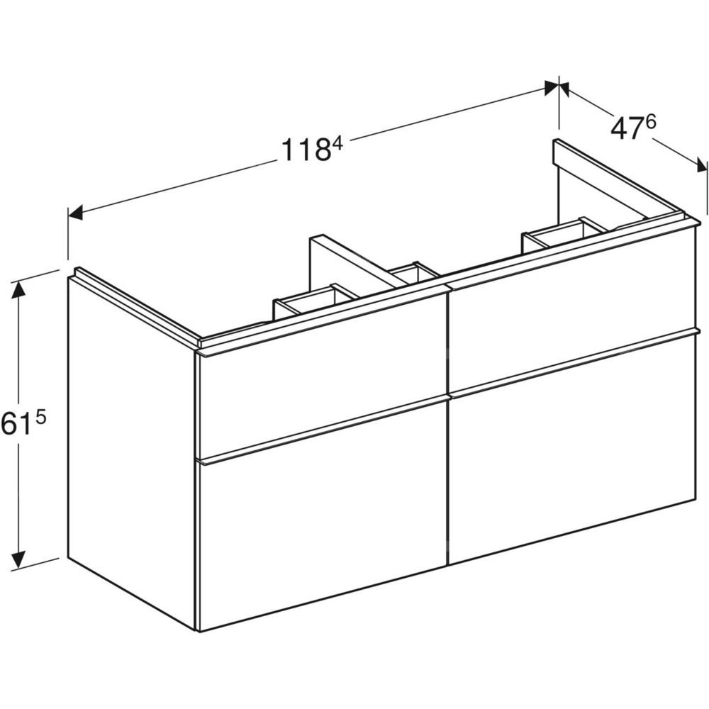 Szafka pod umywalkę podwójną Geberit iCon, z czterema szufladami: Szerokość umywalki=120cm, H=61.5cm, Korpus i front: biały / lakierowany matowy, Uchwyt: biały / powlekany proszkowo, matowy