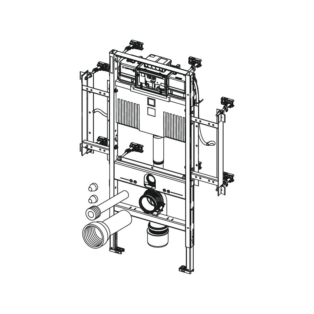 Moduł WC z instalacją przycisków spłukujących „easy fit”. Do mocowania na kształtownikach TECEprofil lub w ściankach UA podtynkowych lub przed ścianą murowaną. Do budownictwa bez barier z podwyższonym mocowaniem ceramiki. Moduł z bocznymi ramami stalowymi i przewodami instalacyjnymi do prowadzenia kabla, łącznie z materiałem mocującym.