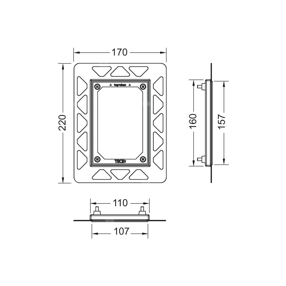 Ramka montażowa do montażu zlicowanego elektroniki do pisuaru TECEfilo ze szkła, TECEfilo z tworzywa oraz TECEfilo-velvet w zabudowie suchej. Ramka montażowa z zakresem regulacji głębokości montażu płytek od 5 do 18 mm (ze śrubami regulacyjnymi o zakresie regulacji 18–33 mm – nr katalogowy 9820181). W komplecie przyssawki do demontażu płytki