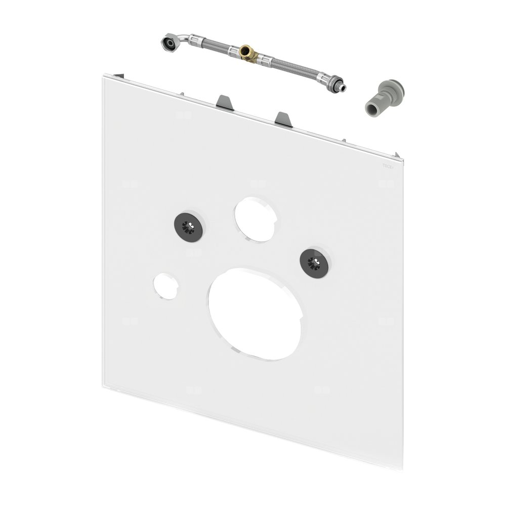 Dolna obudowa szklana do łączenia z toaletą myjącą Geberit Aquaclean Sela, Mera i Tuma, Toto Washlet SG, Toto Washlet EK lub GL z ukrytymi przyłączami, Grohe Sensia, V & B ViClean U+ lub Laufen Riva, w tym samoprzylepna taśma wygłuszająca i wymienny wąż przyłączeniowy do spłuczki oraz adapter z tworzywa 3/8" do zaworu napełniającego F 10.