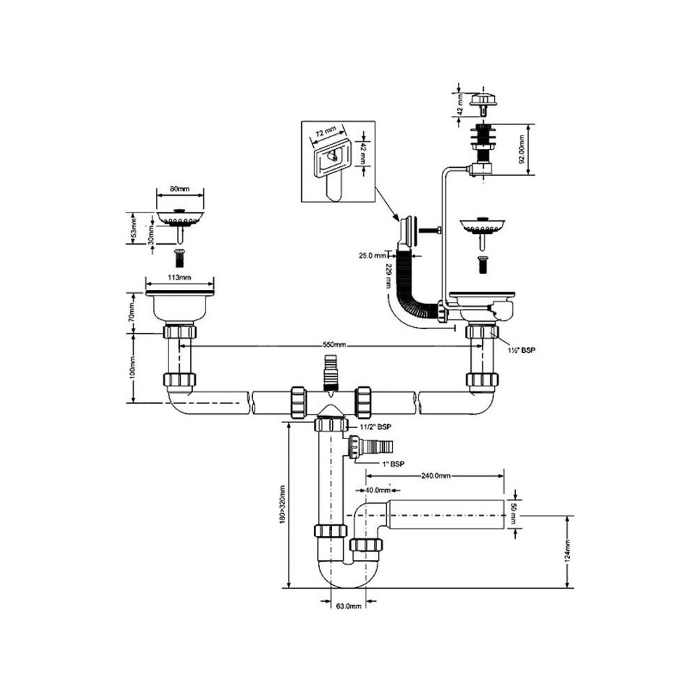 Syfon zlew.rurowy podwójny 3,5"X50mm z podłą.pralki lub zmywarki,spust z mech.automatycznym, przelew