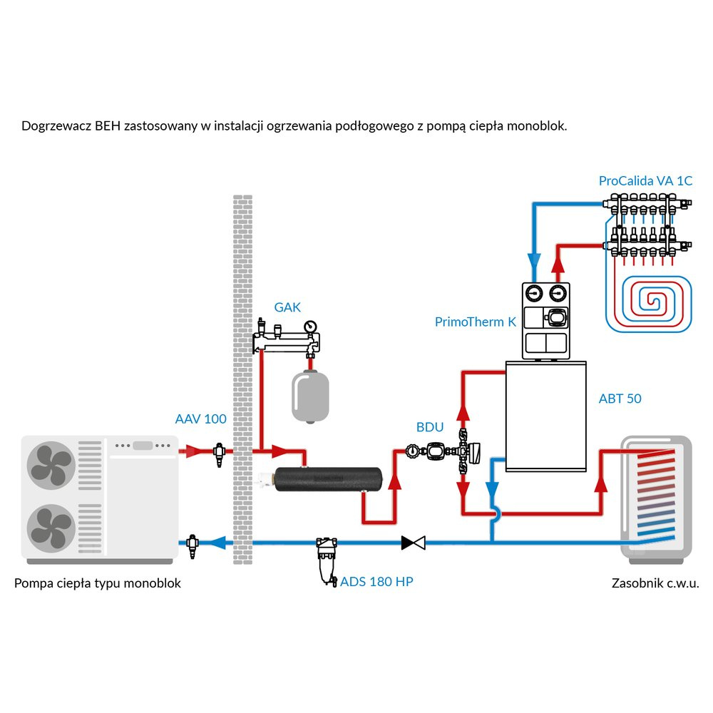 Dogrzewacz przepływowy BEH 462 z grzałką o mocy 2,0 kW, 230 V AC, 2x GW G1 1/4'', 1x GW G1/2''