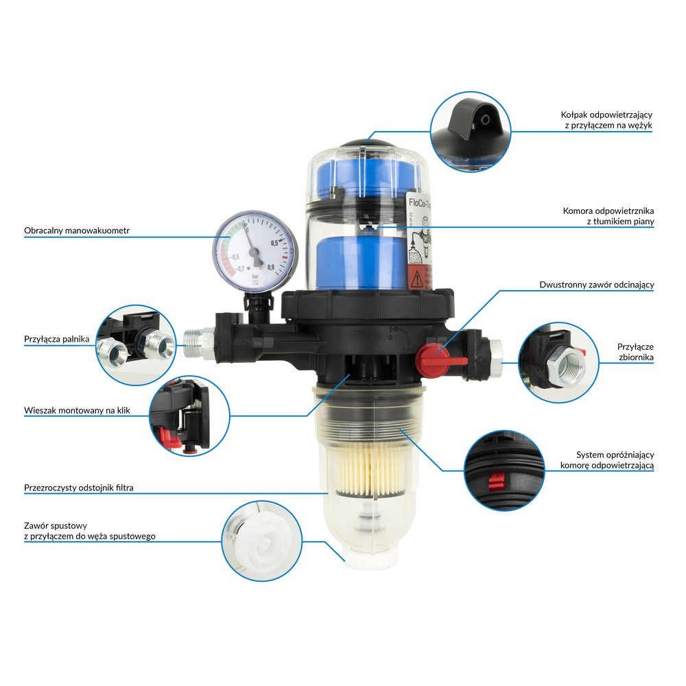 Usuwa z oleju zanieczyszczenia stałe, jednocześnie usuwając pęcherzyki powietrza z oleju, które mogą powodować niestabilną pracę palnika i pompy.