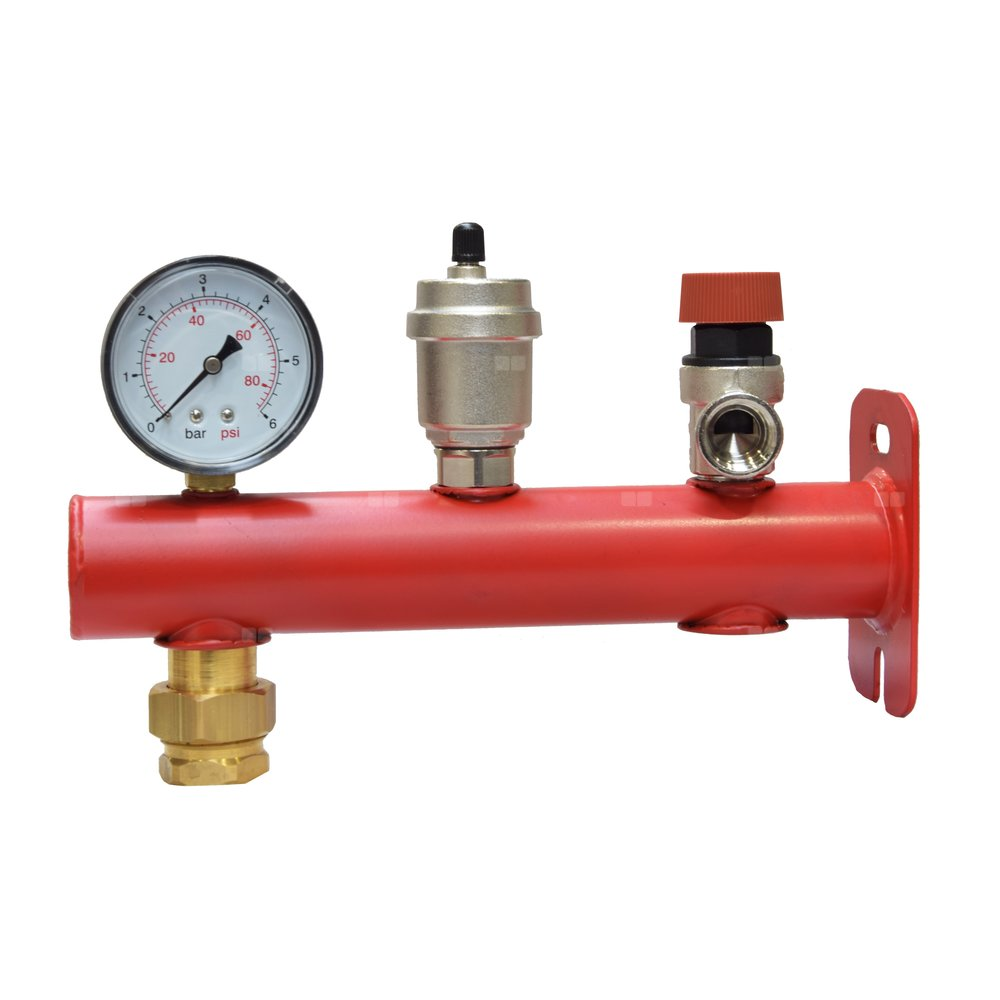 Grupa bezpieczeństwa 3 bar z wyposażeniem, z szybkozłączem 3/4” do naczynia przeponowego (z manometrem, zaworem bezpieczeństwa 3 bar i automatycznym odpowietrznikiem, z szybkozłączem 3/4”)