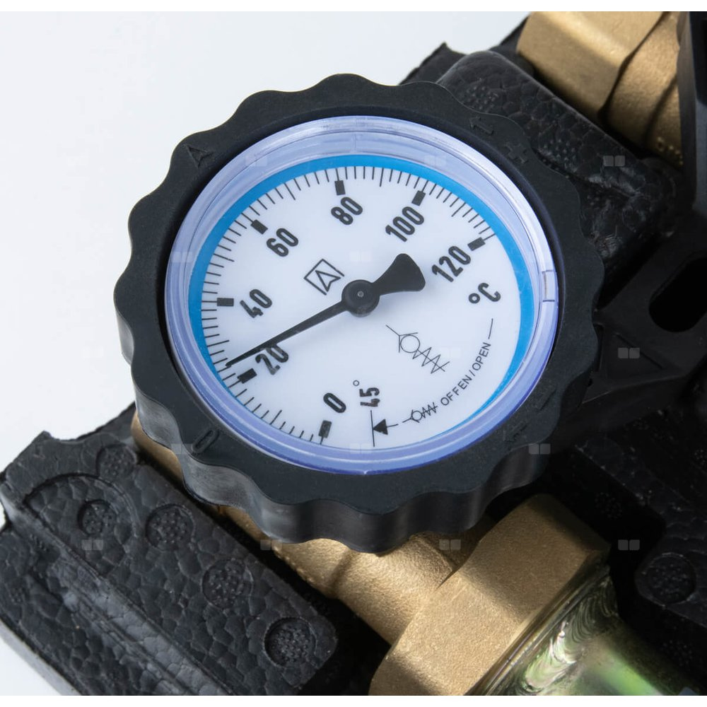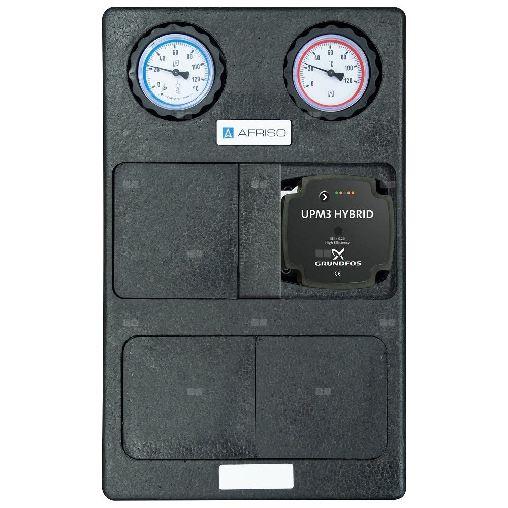 Wyposażona w niezbędne komponenty: termometry, zawór zwrotny, zawory odcinające na zasilaniu i powrocie, zawór odcinający przed pompą i izolację termiczną.