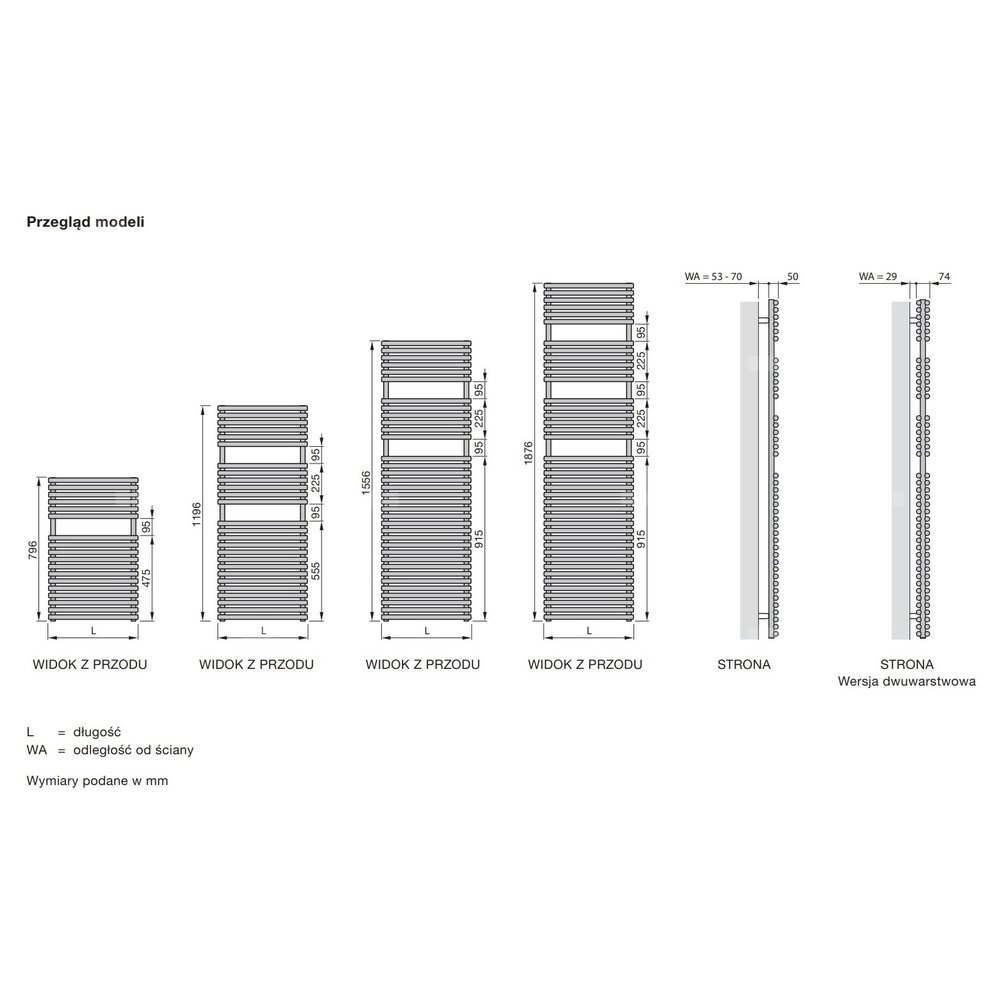 Duże odległości między rurkami oraz ich wygięcie w wyraźny łuk pozwalają na wygodne wieszanie ręczników,