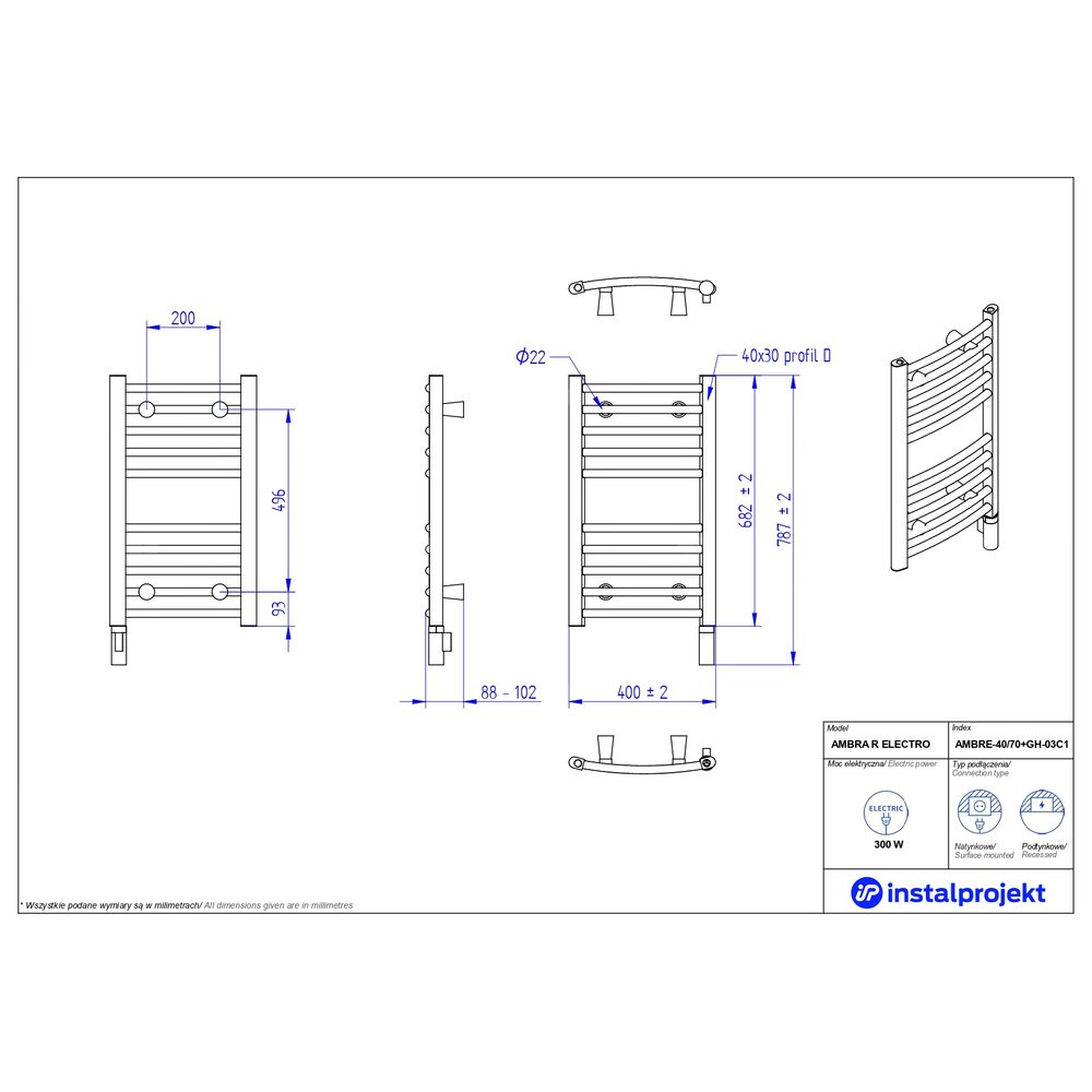 Grzejnik elektryczny (suszarka) INSTAL-PROJEKT AMBRA R ELECTRO, wym. 682 (787 z grzałką)/400 mm, kolor biały połysk, moc 300 W