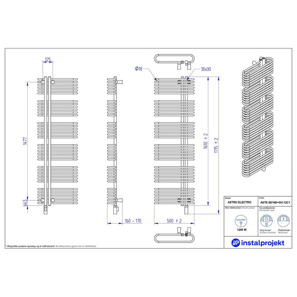 Grzejnik elektryczny (suszarka) INSTAL-PROJEKT ASTRO ELECTRO, wym. 1610 (1715 z grzałką)/500 mm, kolor biały połysk, moc 1200 W