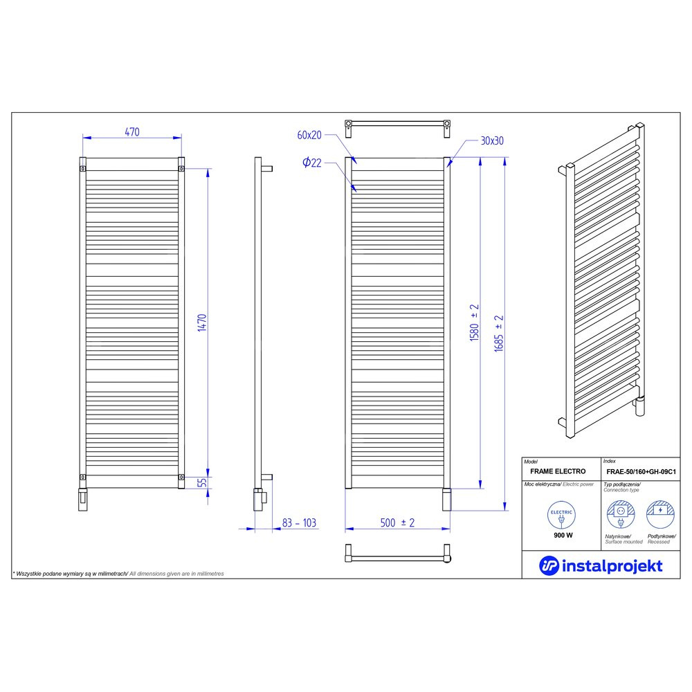 Grzejnik elektryczny (suszarka) INSTAL-PROJEKT FRAME ELECTRO, wym. 1580 (1685 z grzałką)/500 mm, kolor biały połysk, moc 900 W