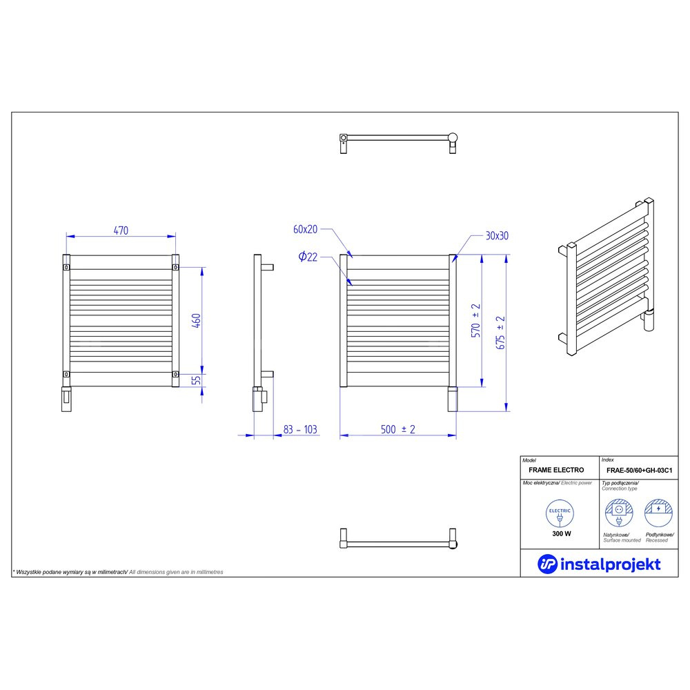 Grzejnik elektryczny (suszarka) INSTAL-PROJEKT FRAME ELECTRO, wym. 570 (675 z grzałką)/500 mm, kolor czarny mat, moc 300 W