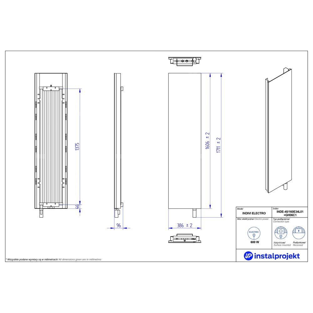 Grzejnik elektryczny (suszarka) INSTAL-PROJEKT INDIVI ELECTRO, wym. 1606 (1711 z grzałką)/386 mm, moc 600 W