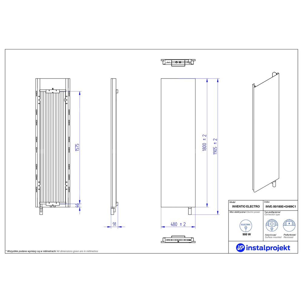 Grzejnik elektryczny (suszarka) INSTAL-PROJEKT INVENTIO ELECTRO, wym. 1800 (1905 z grzałką)/480 mm, moc 900 W