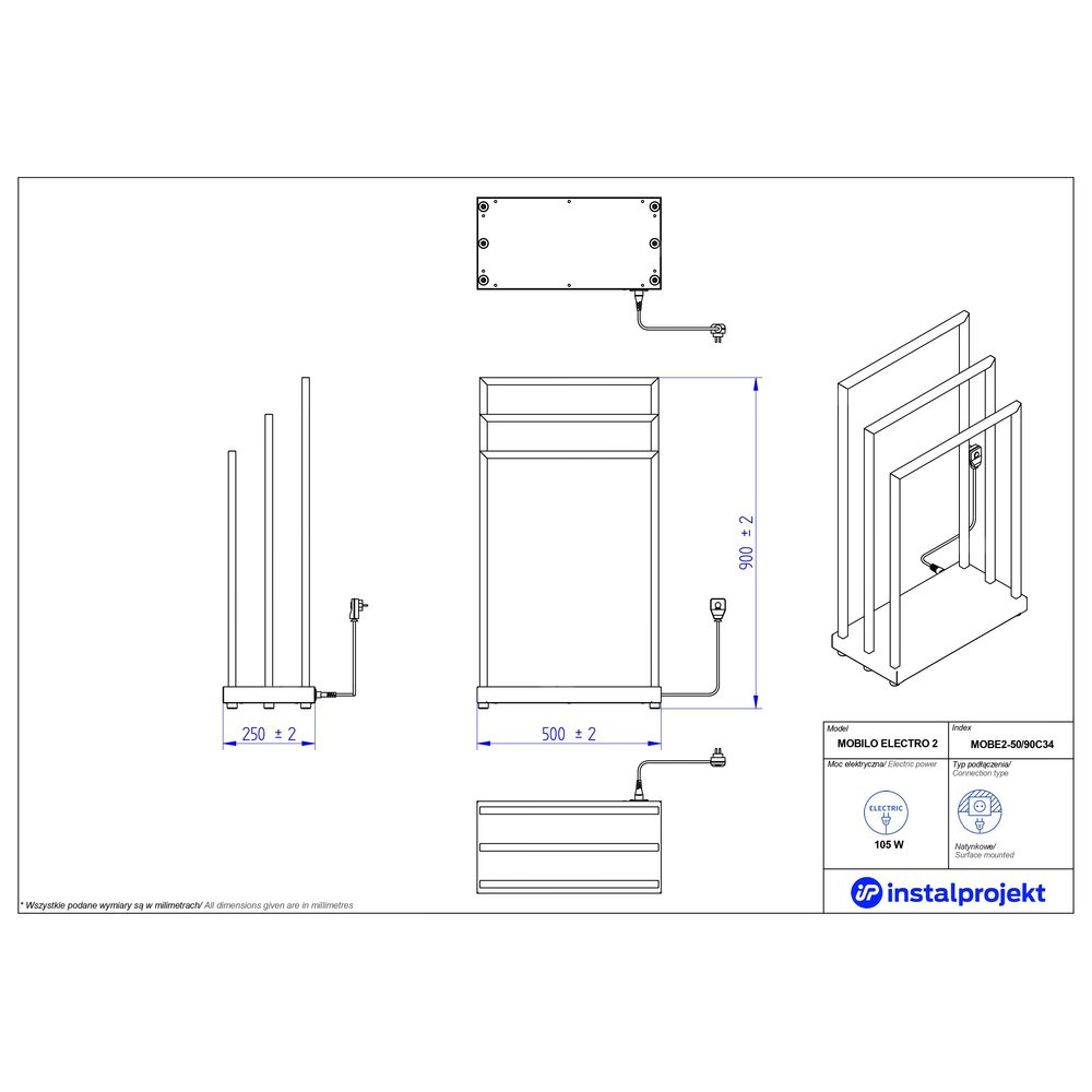 Grzejnik elektryczny (suszarka) INSTAL-PROJEKT MOBILO ELECTRO 2, wym. 900/500 mm, kolor czarny mat, moc 105 W