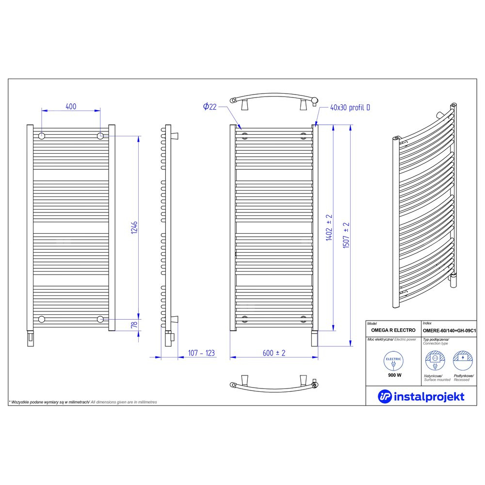 Grzejnik elektryczny (suszarka) INSTAL-PROJEKT OMEGA R ELECTRO, wym. 1402 (1507 z grzałką)/600 mm, kolor biały połysk, moc 900 W