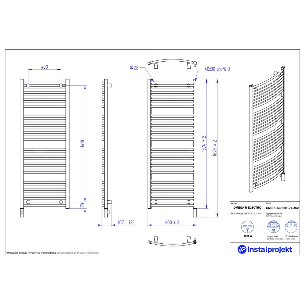 Grzejnik elektryczny (suszarka) INSTAL-PROJEKT OMEGA R ELECTRO, wym. 1574 (1679 z grzałką)/600 mm, kolor biały połysk, moc 900 W