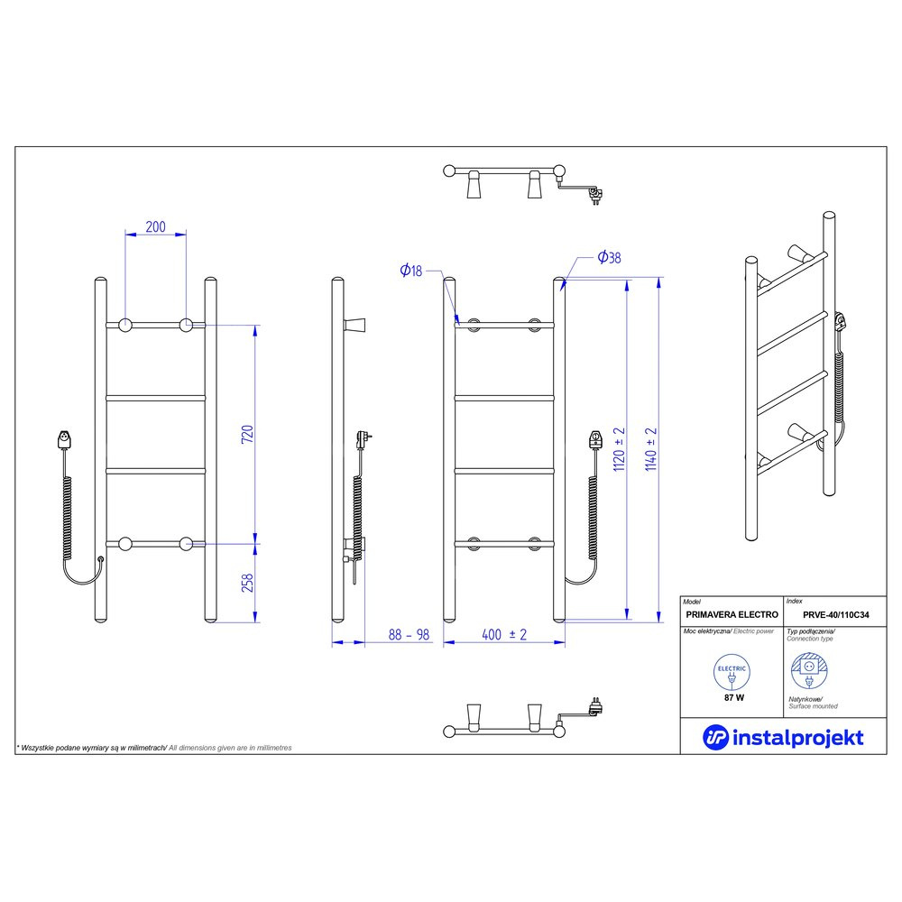 Grzejnik elektryczny (suszarka) INSTAL-PROJEKT PRIMAVERA ELECTRO, wym. 1120/400 mm, kolor biały mat, moc 87 W