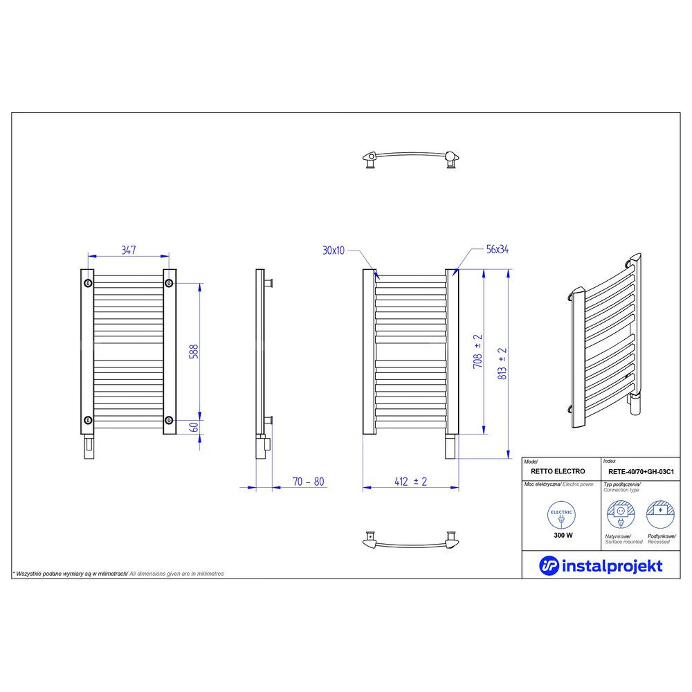Grzejnik elektryczny (suszarka) INSTAL-PROJEKT RETTO ELECTRO, wym. 708 (813 z grzałką)/412 mm, kolor czarny mat, moc 300 W
