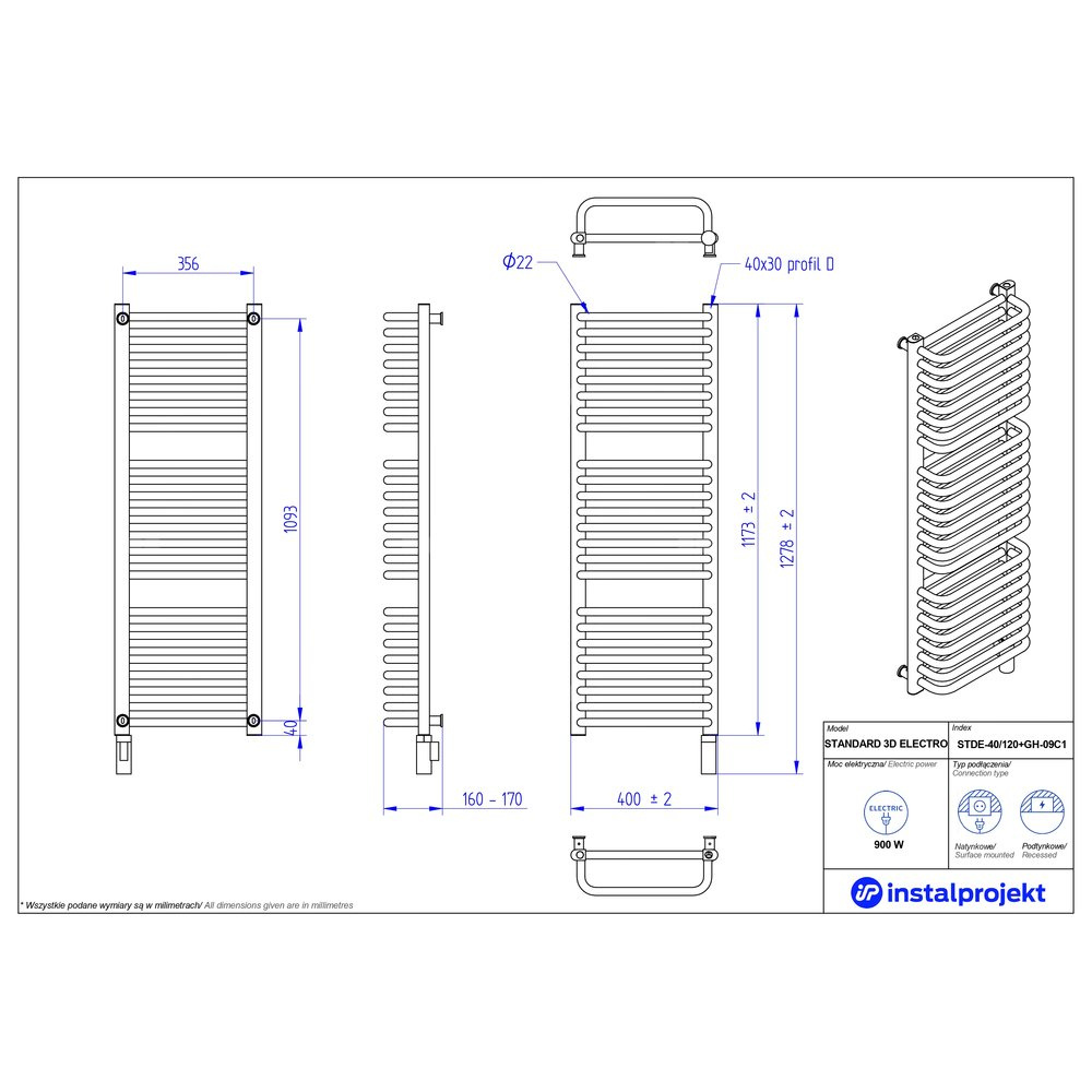 Grzejnik elektryczny (suszarka) INSTAL-PROJEKT STANDARD 3D ELECTRO, wym. 1173 (1278 z grzałką)/400 mm, kolor biały połysk, moc 900 W