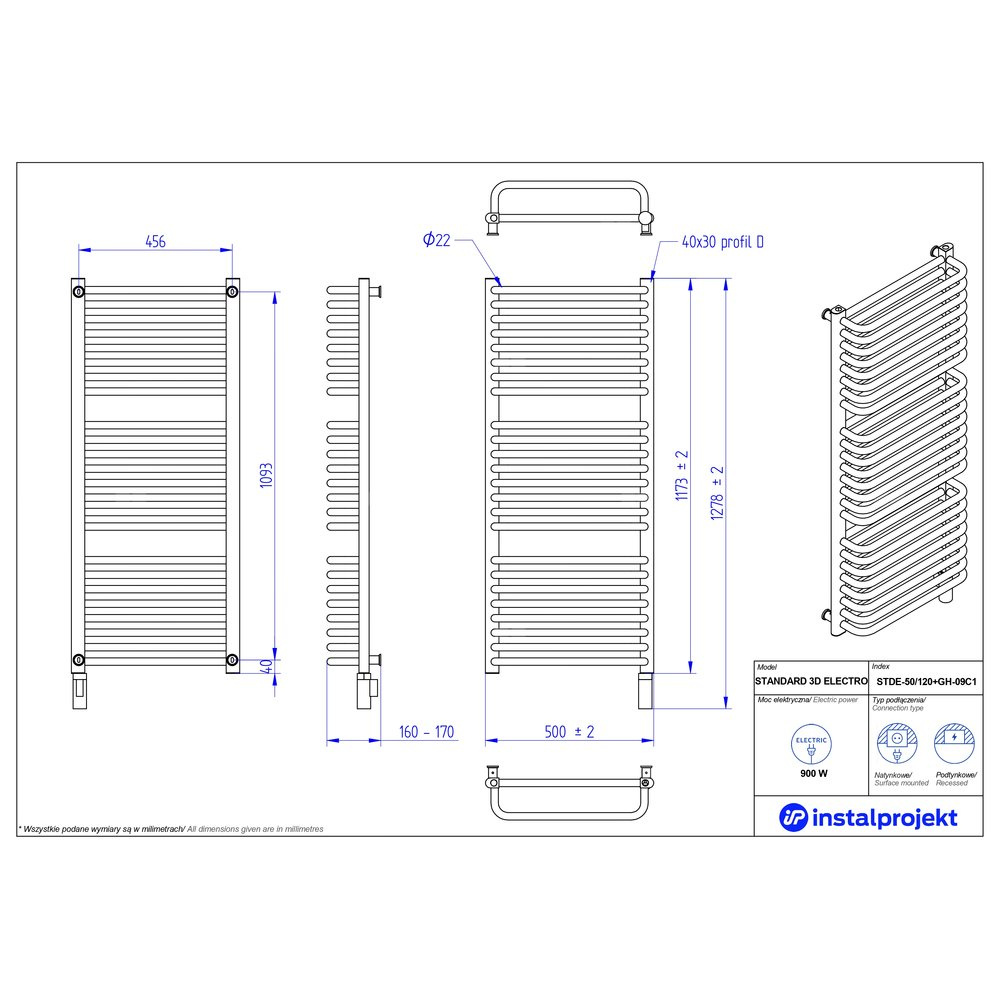 Grzejnik elektryczny (suszarka) INSTAL-PROJEKT STANDARD 3D ELECTRO, wym. 1173 (1278 z grzałką)/500 mm, kolor biały połysk, moc 900 W