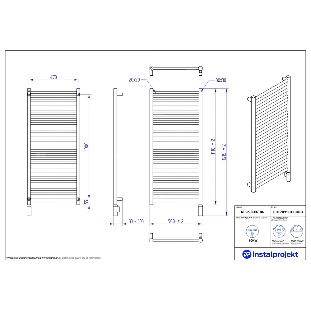 Grzejnik elektryczny (suszarka) INSTAL-PROJEKT STICK ELECTRO, wym. 1110 (1215 z grzałką)/500 mm, kolor biały połysk, moc 600 W
