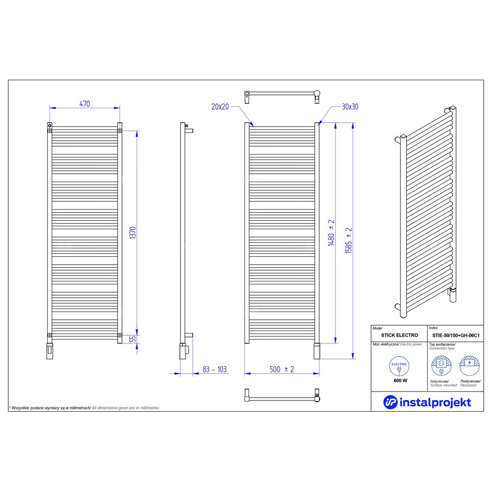Grzejnik elektryczny (suszarka) INSTAL-PROJEKT STICK ELECTRO, wym. 1480 (1585 z grzałką)/500 mm, kolor biały mat, moc 600 W