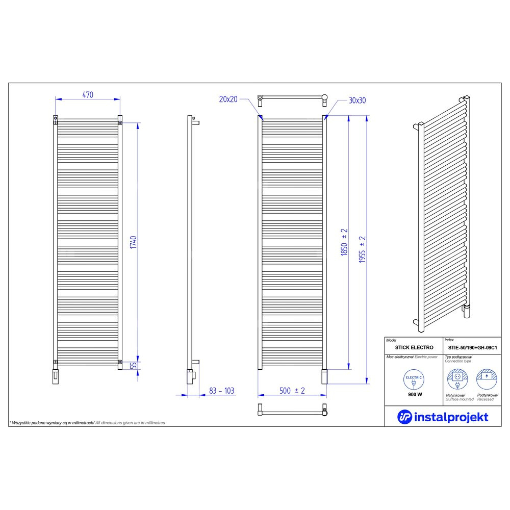 Grzejnik elektryczny (suszarka) INSTAL-PROJEKT STICK ELECTRO, wym. 1850 (1955 z grzałką)/500 mm, kolor czarny mat, moc 900 W