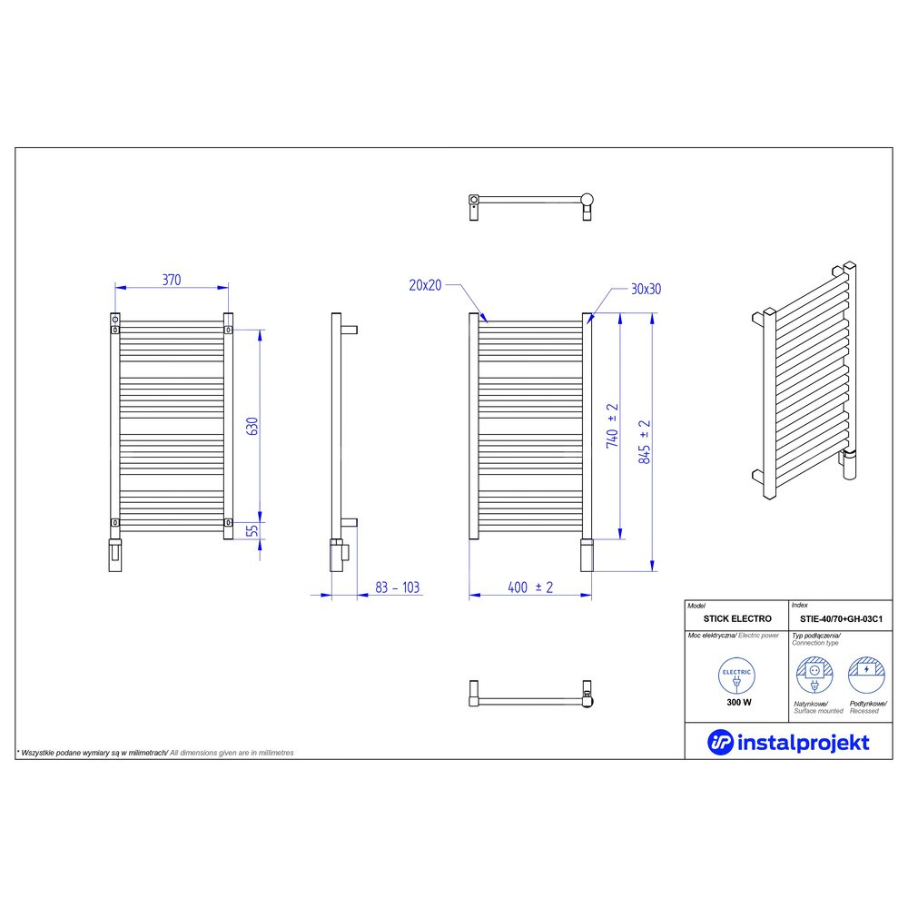 Grzejnik elektryczny (suszarka) INSTAL-PROJEKT STICK ELECTRO, wym. 740 (845 z grzałką)/400 mm, kolor biały połysk, moc 300 W