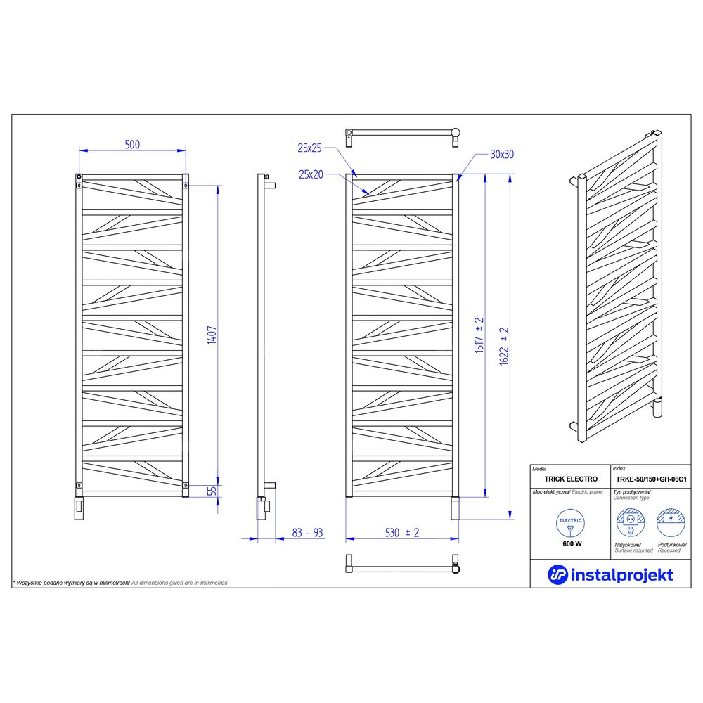 Grzejnik elektryczny (suszarka) INSTAL-PROJEKT TRICK ELECTRO, wym. 1517 (1622 z grzałką)/530 mm, kolor czarny mat, moc 600 W