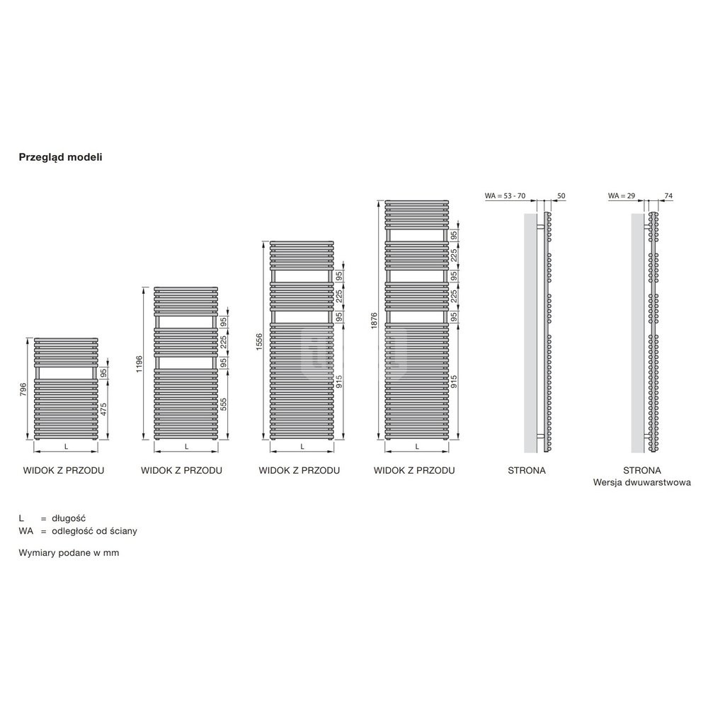 Duże odległości między rurkami oraz ich wygięcie w wyraźny łuk pozwalają na wygodne wieszanie ręczników,