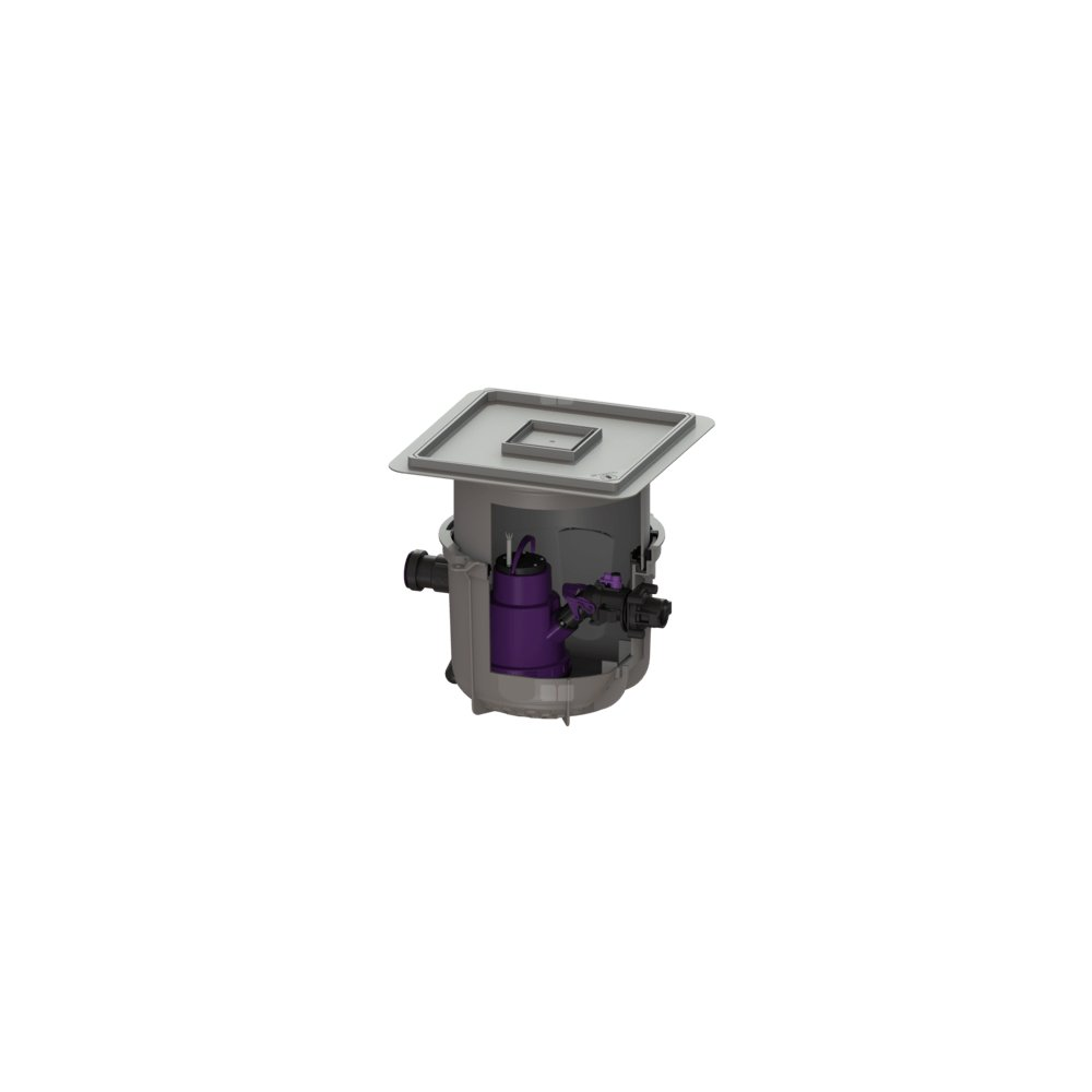 Gotowa do przyłączenia przepompownia do użytku w ograniczonym zakresie jest przystosowana do usuwania ścieków z pojedynczych miejsc odpływu. Pompę zatapialną z przełącznikiem pływakowym można łatwo wyjąć przy pomocy zamknięć jednoręcznych. Zbiornik wykonany z tworzywa sztucznego (PP) posiada otwartą komorę pompy i jest odporny na działanie agresywnych ścieków. Urządzenie do zabudowy w płycie podłogowej jest wstępnie zmontowane do montażu końcowego w miejscu instalacji.