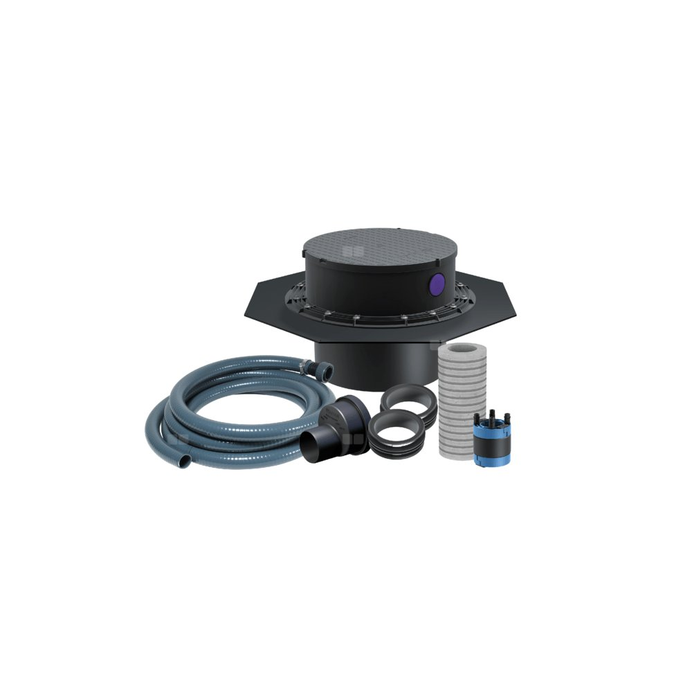 Wodoszczelny zestaw instalacyjny dla firm budowlanych do przepompowni Aqualift Compact i przepompowni hybrydowych Ecolift firmy KESSEL w połączeniu z wodoszczelnymi płytami podłogowymi, składający się z przedłużki, środkowego kołnierza wodoszczelnego, zestawu przewodu ciśnieniowego, kołnierza uszczelniającego, rury okładzinowej z uszczelnieniem okrężnym do przewodu giętkiego ciśnieniowego oraz przejściówki.