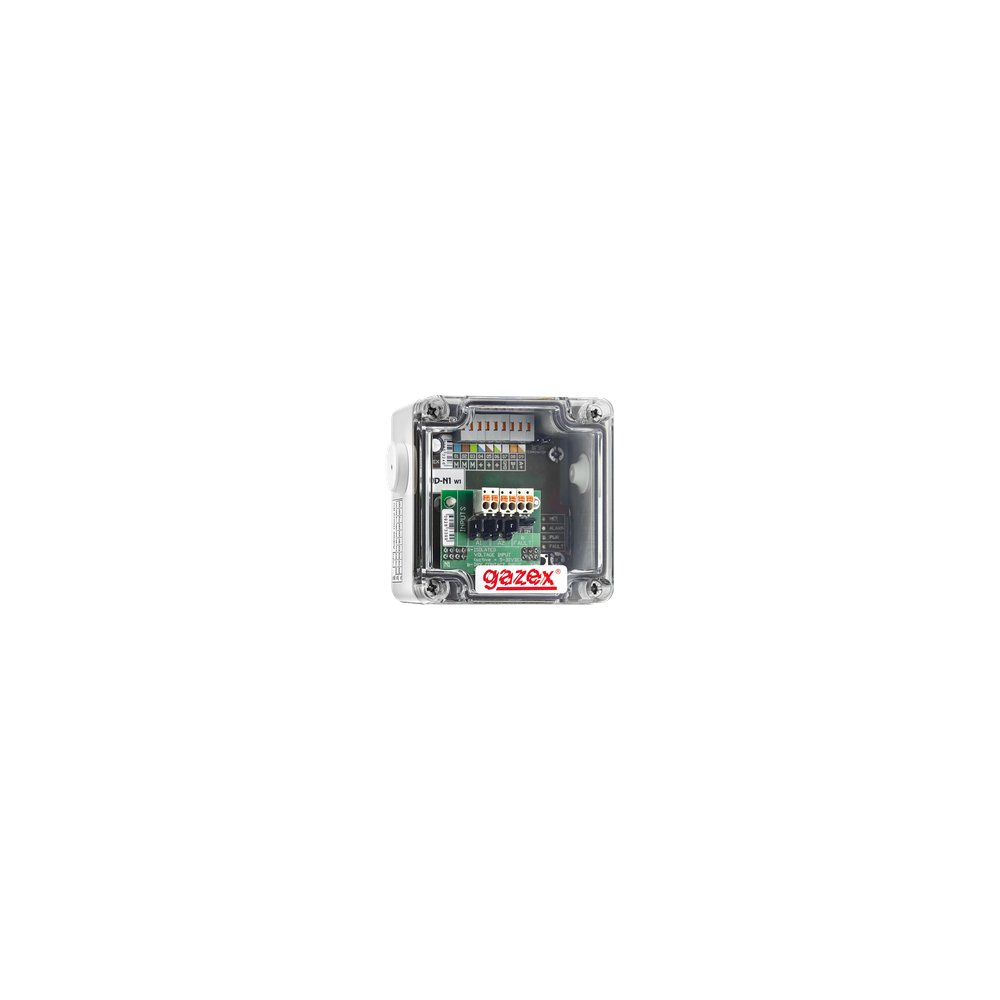 Cechy użytkowe 3 wejścia beznapięciowe (sterowane z wyjść stykowych systemu zewnętrznego), w tym 2 z nich z możliwością konfiguracji do podłączenia zewnętrznych wyjść alarmowych 12V~; port RS-485, protokół MODBUS RTU, galwanicznie izolowany; testowanie “bezdotykowe” (magnetycznie, bez otwierania obudowy); zasilanie 24V~ z magistrali z pojedynczym przewodem FTP; wszystkie zaciski bezśrubowe, zdejmowalne; zaciski wejściowe z możliwością łączenia żył wielodrutowych (linka, bez zaciskania tulejek) = bardzo proste i szybkie podłączenie/instalacja, ułatwiona konserwacja; szczelna, odporna mechanicznie obudowa; konfiguracja ustawień modułu poprzez moduł nadzorczy MDD-256/T (manualnie za pomocą klawiatury na panelu czołowym) lub przez dedykowane oprogramowanie konfiguracyjne „DETnet View”, dostępne pod adresem https://www.https://www.gazex.com/oprogramowanie/. Schemat blokowy Wyjścia sterujące alarmowe 12V~ 2 Wyjścia sterujące stykowe 4 Wyjście sterujące awaryjne --- Wyjście cyfrowe RS-485 --- Montaż na szynie TS35 --- Napięcie zasilania 24V~ Wymiary 106 x 90 x 65 mm