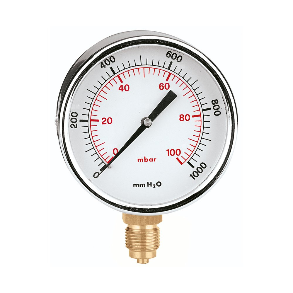 Manometr gazu. Przyłącze: G 3/8" A (ISO 228-1) GZ, podłączenie dolne. Wymiary/ Średnice: Ø 80 mm. Klasa dokładności: Manometr UNI 1,6. Skala manometru: 0–60 bar.