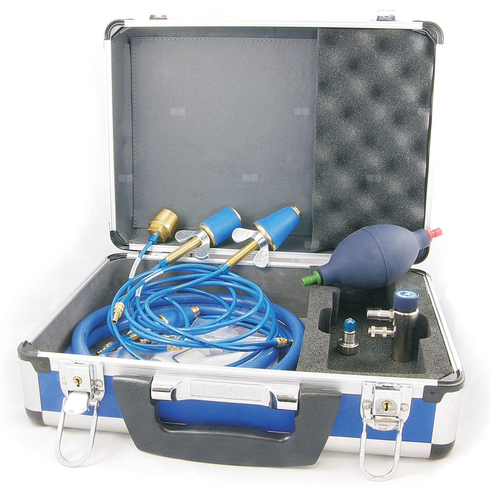 - Wyposażony w aluminiową walizkę, zawór odcinający, pompkę, różnego typu przyłącza do instalacji.