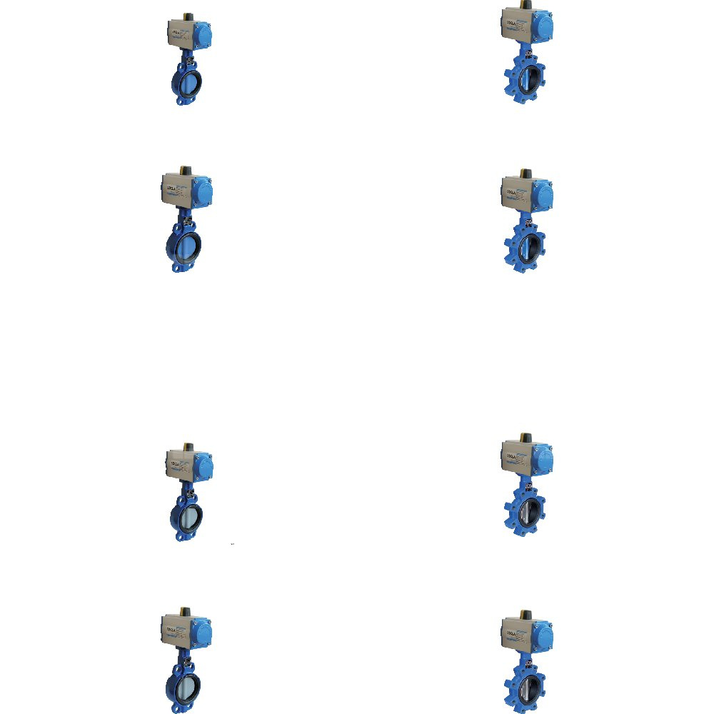 Przepustnica bezkołnierzowa SYLAX z napędem pneumatycznym SOCLA dwustronnego działania (ciśnienie powietrza zasilającego 6 bar), dysk: GGG40 epoksyd., wykładzina: EPDM, korpus: GG25 epoksyd., Pnom 0,6 MPa, tmax=120 st.C