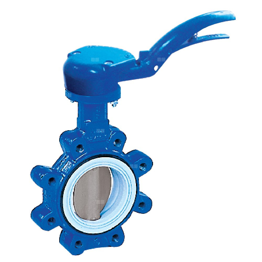 Przepustnica z otworami gwintowanymi TILIS z napędem ręcznym dźwigniowym, dysk: AISI316, wykładzina: PTFE, korpus: GGG40 epoksyd., Pnom 1,0 MPa, tmax=150 st.C DN65