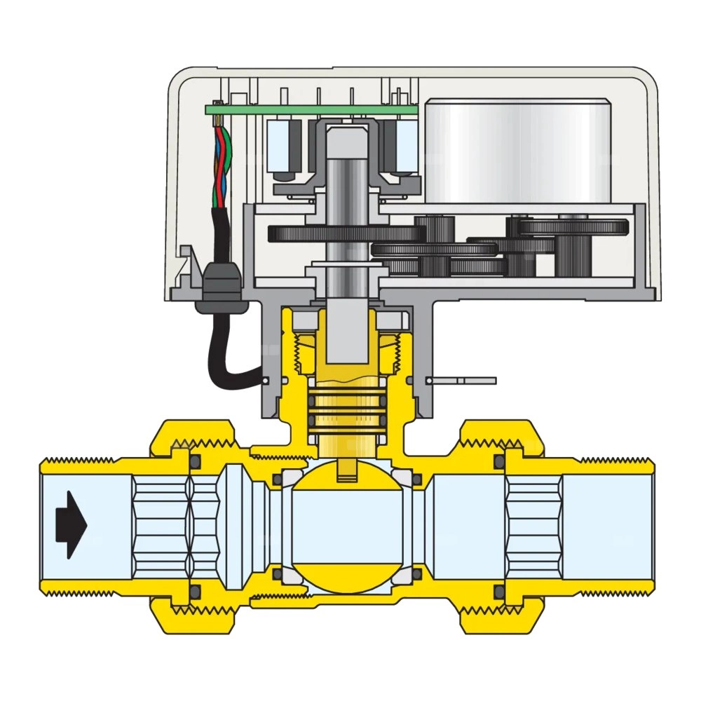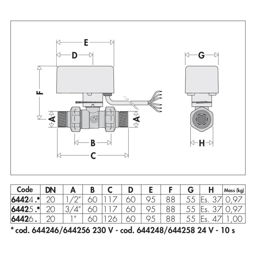 Dwudrożny, zawór kulowy z napędem Z mikroprzełącznikiem pomocniczym Z siłownikiem ze sterowaniem 3-punktowym Przyłącze: G 1" A (ISO 228-1) GZ. Maksymalne ciśnienie pracy: 10 bar. Zakres temperatury medium: -5–110 °C. Zakres temperatury otoczenia: 0–55 °C. Zasilanie elektryczne: 24 V (AC). Pobór mocy: 4 VA. Stopień ochrony: IP 44 (w pozycji pionowej), IP 40 (w pozycji poziomej). Długość przewodu zasilająego: 1 m. Styk mikroprzełącznika pomocniczego (230 V): 0,8 A. △p max.: 10 bar. Kv: 11,1 m³/h. Czas zadziałania: 40 s (obrót 90°).