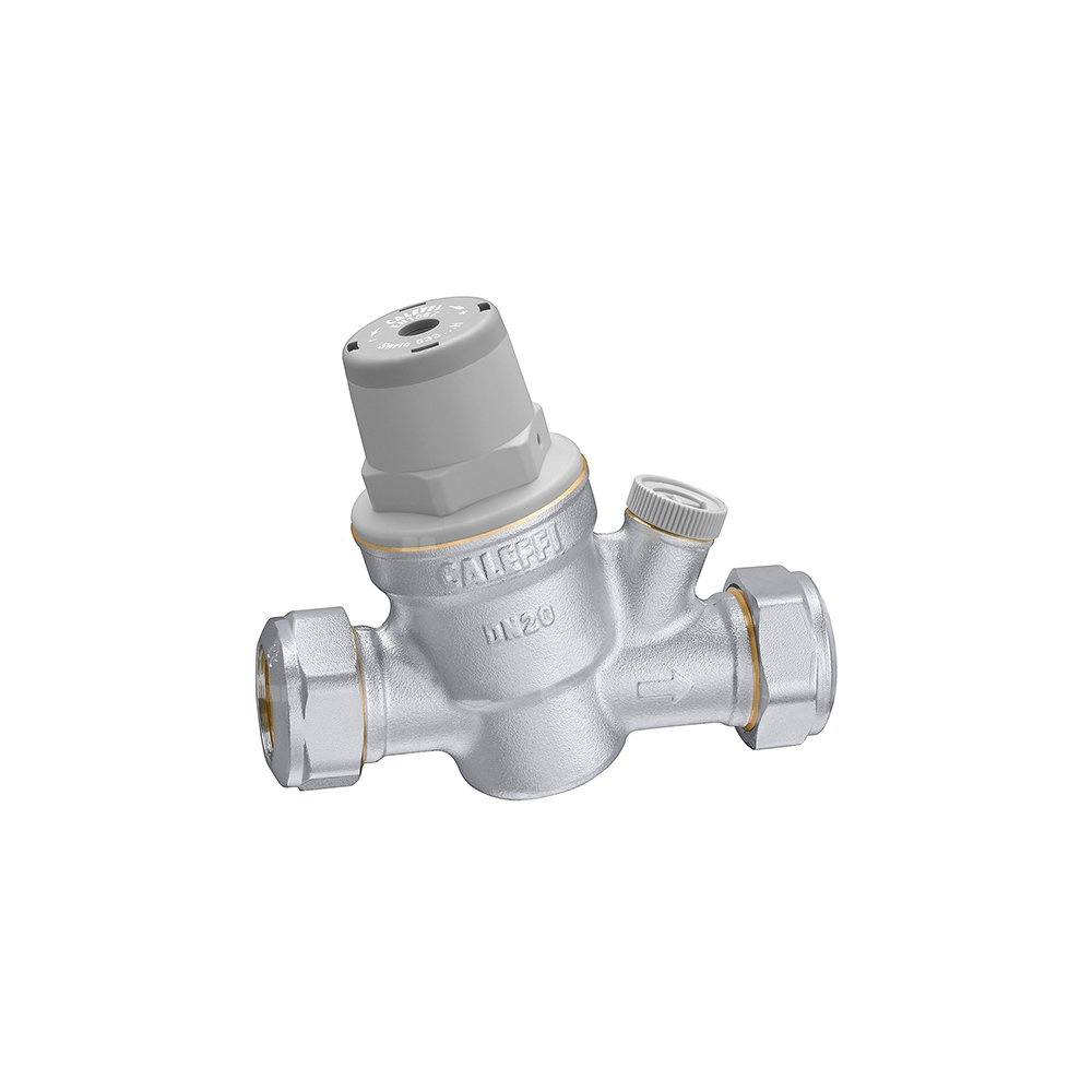 Regulator ciśnienia ze złączkami zaciskowymi wersja skośna Zgodny z PN EN 1567. Wkład i filtr wymienny. Dla wysokich temperatur. Z przyłączem na manometr 1/4". Przyłącze: Ø 22. Maksymalne ciśnienie wlotowe: 16 bar. Zakres temperatury medium: 2–80 °C. Zakres regulowanego ciśnienia: 1–5,5 bar. Wykończenie: chromowane. Materiał: stop mosiądzu odporny na odcynkowanie.