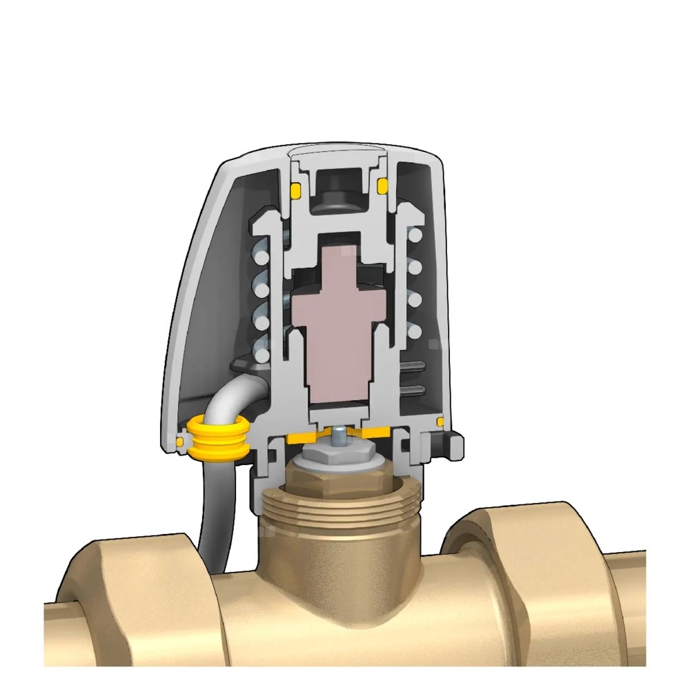 Siłownik termoelektryczny. Z mikroprzełącznikiem pomocniczym Ze wskaźnikiem pozycji otwarcia. Montaż przy użyciu szybkozłącza, z przyłączem wciskowym. Normalnie zamknięty. Do zaworów serii 338, 339, 401, 402, 425, 426, 421, 422, 455, 456, 220, 221, 222, 223, 224, 225, 226, 227, 230, 231, 232, 233, 234, 237, 676, 677, 678 i rozdzielaczy serii 670, 671, 668.S1,664, 665. Zakres temperatury otoczenia: 0–50 °C. Zasilanie elektryczne: 24 V (AC). Pobór mocy: 3 W. Stopień ochrony: IP 54. Długość przewodu zasilająego: 0,8 m. Styk mikroprzełącznika pomocniczego (230 V): 0,8 A. Prąd rozruchowy: ≤ 1 A.